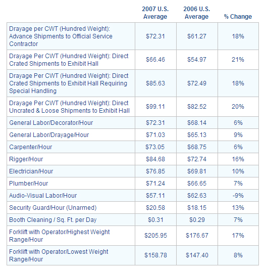 In a study recently reported by Tradeshow Week, the average labor and drayage costs for all of the major-venue cities in North America were tabulated. Drayage took an across-the-board hike of 19%, the largest annual increase over the past four years. Among the labor rates where most categories reported an increase, Riggers, Highest Weight Range Forklift operators and Security Guards drew the highest increases.
