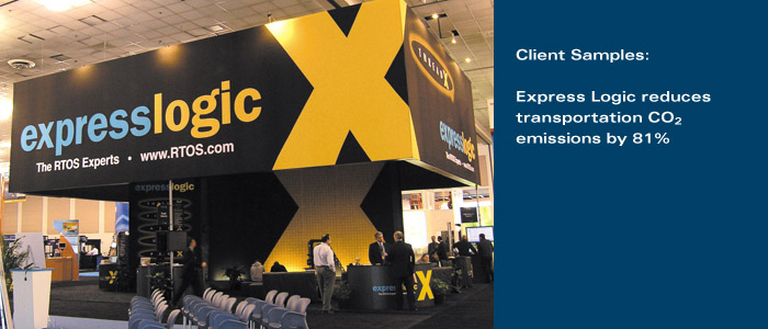 Express Logic's former traditional custom trade show exhibit weighed a whopping 30,000 pounds. They replaced it with a Skyline custom modular exhibit that creates a huge at-show presence with only 6,305 pounds. Ship the Skyline exhibit to a show 500 miles away, for a 1,000 mile round trip, and the weight savings would lower CO2 emissions by 7,819 pounds for the round trip -- more than the weight of the Skyline exhibit itself.