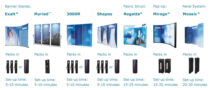 Skyline has a variety of portable trade show systems that offer big graphics and a professional look, yet are lightweight, simple to install, and pack small for easy transport.
