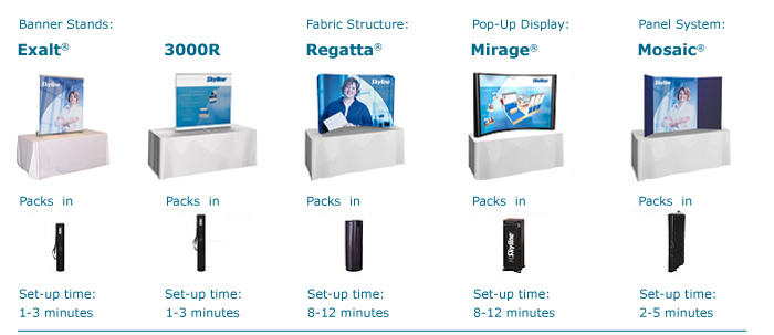 Skyline tabletop displays provide a powerful exhibiting presence with systems that are portable and convenient! Our full range of tabletop display systems are easy to transport, quick to set up and are engineered to last for years -- giving you great value.