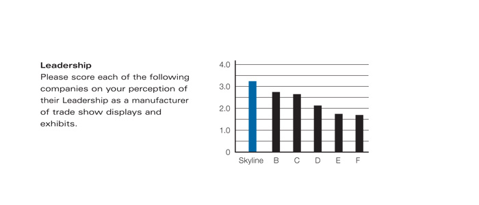 The survey also indicated that Skyline has developed into a strong option on larger exhibits. When asked which suppliers they "possibly" or "very likely" would consider for an exhibit larger than 10'x20', 86 percent of respondents identified traditional custom houses and 76 percent picked Skyline. Among portable-exhibit suppliers, Skyline was the overwhelming top choice on large exhibits.