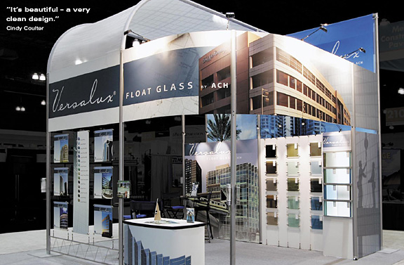 Cindy Coulter got everything she wanted in a new exhibit for the architectural division of ACH Glass Operations: Open design. "It's beautiful - a very clean design," says Coulter, marketing manager. Intriguing graphics and sophisticated architecture invite attendees to enter the exhibit on three sides. "That's really helpful because you never know where traffic is going to come from," Coulter says. Height. The fourth side features a skyscraper-like photomural - 16 feet tall and 20 feet wide. "We wanted to be seen from a distance," Coulter says. Temporary graphics. Skyline's fabric graphics can be replaced at a reasonable price. Light box. Skyline designed a backlit, cable-mounted system to display the company's 15 shades of tinted glass and built a custom light box so attendees can simulate two layers of insulated glass. "It works great," Coulter says. "Every time you look, two or three architects are back there, thinking about their projects." Download printable version (.pdf) |