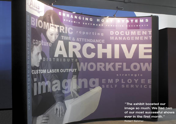 Upgrading from Velcro®-attached logos on a carpet backdrop to a seamless mural on a 10' curved backwall produced immediate results for AIG Technology. "It's been phenomenal," says Robert Satcher, vice president. "The exhibit boosted our image so much. We had two of our most successful shows ever in the first month." Key words on the graphic help tell the story of AIG Technology, whose software is used to enhance ERP systems. The Mirage® pop-up display matches the company's new marketing materials. It also provides quick and easy set-up. After seeing the exhibit increase traffic and make prospects stop in their tracks, Satcher has raised his expectations "Improving our marketing and getting a first-class exhibit will help us get beyond our home territory," he says. "In 6 to 12 months, going into new territories, I think we'll attribute a lot of name recognition to the display." Download printable version (.pdf) |