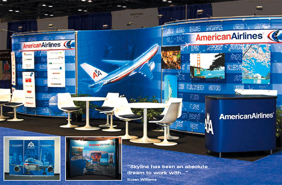 Before: American Airlines (AA) had six aging 10' display units for small shows, a 30' custom cutaway fuselage for large shows, no good solution for in-between shows, and big bills to ship, install, dismantle and store the cumbersome structures. After: With Skyline as its partner, AA bought a fleet of banner stands and pop-up displays for small shows, rented a variety of exhibit structures up to 20' by 20' for in-between shows, and slashed non-productive trade show expenses. Better yet, AA's biggest show of the year was its most successful ever, and the cumulative cost savings allowed the airline to expand its show schedule. Susan Williams, AA's Manager of Brand Management & Targeted Marketing, uses Skyline as an extension of her department. She taps into Skyline's expertise for trade show planning and exhibit management services - coordination of storage, shipping, installation and at-show troubleshooting through Skyline's global network - that are tailored to the airline's needs. "Skyline has been an absolute dream to work with, and I don't give out compliments like that easily," Williams says. Download printable version (.pdf) |
