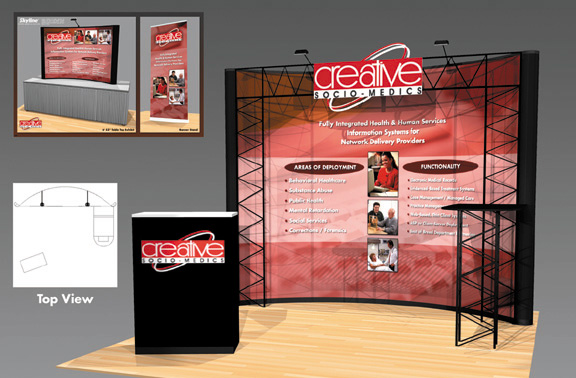 Creative Socio-Medics Marketing Director Ron Marge wasn't with the company when it bought its first Skyline display about six years ago. But when he needed to update the company's trade show image to mirror the firm's new marketing theme, he contacted Skyline. "We've been happy with Skyline's past performance, that's why we came to them now," says Ron. "We visited with the folks at Skyline about our needs and sketched what we were looking for." A 10' Mirage® Plus display was at the top of Ron's wish list. Skyline surprised Ron by also presenting the design, in slightly different proportions, for tabletop and banner stand graphics. Then it was Ron's turn to surprise Skyline - by buying all three! Now he can bring a consistent look to all their 25 shows. "We're a high-tech company, so we were after high-tech look," said Ron. "We achieved that look by developing new exhibits that adhere closely to our brand. It looked great." Download printable version (.pdf) |