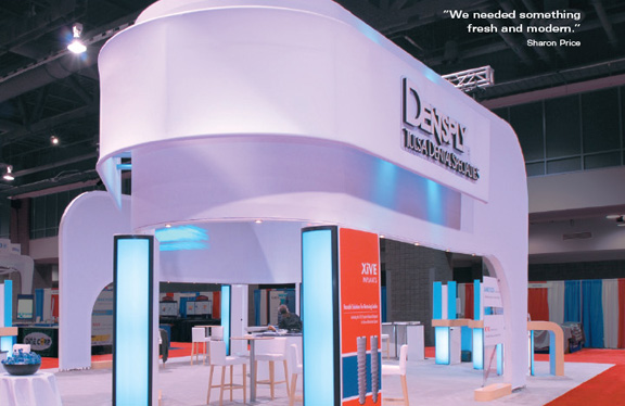Knowing that even a dominant player needs to make a strong impression when entering a new market, two merged divisions of Dentsply International upgraded to a brand-building 40'-by-50' custom modular exhibit. "Having a premium brand image at major dental shows helped us draw some of the leading doctors in our industry. We consider that a huge success," says Sharon Price, Marketing Communications Group Manager. "We stood toe to toe with the dental-implant market leaders because of the presence we conveyed with that booth." "We needed something fresh and modern," Price says. "It also needed openness and comfort to invite doctors in for conversations. Skyline developed an aesthetic and functional design that met those needs." Dentsply rented the main structures and purchased the fabric graphics and workstations. Over time, Price plans to buy more of the durable, lightweight framework because it slashes shipping costs, and reconfigures in a variety of layouts. Download printable version (.pdf) |