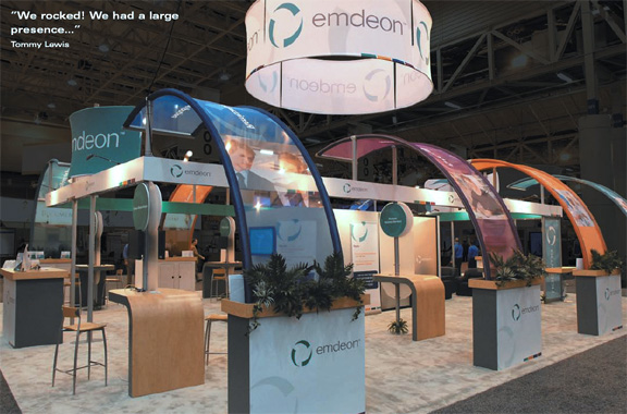 In the wake of multiple name changes through mergers and acquisitions, Emdeon Business Services was a leading provider of healthcare information technology and a leading sufferer of retention deficit disorder - the inability of prospects to remember the current company name. Now following a strict regimen of brand awareness, including large doses of exhibiting, Emdeon showed signs of a speedy recovery with a brand-building 40'-by-50' island at its biggest trade show of the year. "We rocked! We had a large presence, a good location and a fresh-looking booth," says Tommy Lewis, the company's Vice President of Marketing. Skyline designed the exhibit to turn heads and to reinforce Emdeon's brand identity. A rotating fabric structure drew attention to the logo, while other signage called to targeted markets. New graphic skins for the company's 15 to 20 Skyline pop-up displays will promote the brand at state and local shows. Download printable version (.pdf) |
