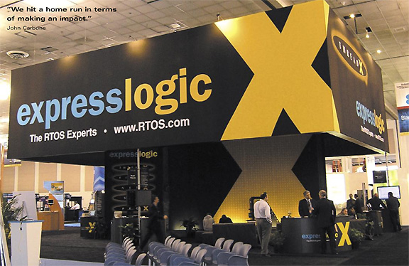 For the biggest show of the year, Express Logic left no doubt about the location and identity of the industry's dominant player. A giant yellow X marked the spot and anchored the company's new logo on an exhibit towering 24 feet high along the perimeter of a 40'-by-50' space. "We hit a home run in terms of making an impact," says John Carbone, vice president of marketing. "We wanted to impress our partners and intimidate our competitors. It was a rousing success. "We wanted to create a booth that gives us a 'wow' factor," Carbone says. "The hanging structure is a perfect solution. It's light and inexpensive, and we're not sacrificing anything in quality. Fabric makes all the sense in the world." Cut Down on Operating Costs Download printable version (.pdf) |