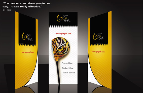 When Gil Hicks, owner of GCT Golf, visited his local Skyline dealer to get a new display for his upcoming trade show, he was surprised and impressed with the Skyline Banner Stand 3000-R. "The Banner Stand gave me more than I expected. I can use two or three together, or separately. I can use them at trade shows or other sites. I can market both my products. It's extremely flexible." "Because the banner stand is so quick and easy to put up and down, when we go to golf courses or other sites, we can set them up to indicate what additional services we offer." At his first show, Gil had a bad position in the hall, but "the banner stand drew people our way. It was really effective. We started conversations with some pretty high-profile companies." Before buying, Gil asked around about Skyline. "A lot of people said Skyline made good, high quality displays. It was very pleasant talking with my Skyline consultants. I'm very pleased with the design work. Very happy with it all." Download printable version (.pdf) |