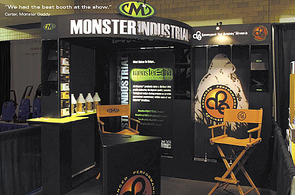 Monster Daddy made an appropriately super-sized impression and left other exhibitors cowering in its trade show debut. "We had the best booth at the show," says Carter, founder of Monster Daddy, an intellectual-property holding and licensing company. The exhibit commanded attention for two operating companies: Monster's high-end Industrial line of cleaning products and Advanced Performance Engineering (APE) tools, including monkey wrenches with improved design. "We want people to take notice of how it is supposed to be done," Carter says. "We have extremely high-quality products, and Skyline created a booth with in-your-face quality." The exhibit helped succeed in placing the Monster Industrial brand line of products in a tool-and-equipment retailer's stores, catalog and online store. "The booth really worked - even more than I expected," Carter says. "We got really good results." Download printable version (.pdf) |