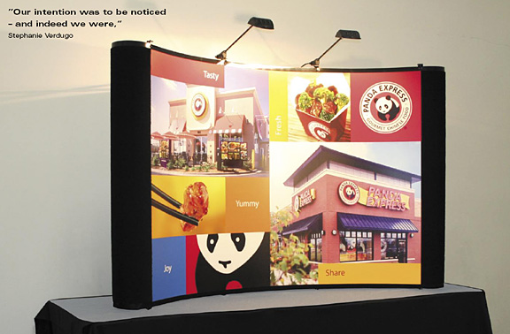 A picture may say a thousand words, but a photomural allows Panda Express to emphasize just three: fast, hot and fresh. Panda Express uses the tabletop exhibit to promote its brand and image - America's No. 1 Chinese quick-service concept with more than 800 restaurants - at trade shows and industry conferences. "People were attracted to the bold images and colors. Our intention was to be noticed - and indeed we were," says Stephanie Verdugo, Panda Express Real Estate Administrator. Two 6'-wide tabletop exhibits and two matching 10' full-size exhibits deliver a consistent message at a variety of events throughout the country. Exhibit staff appreciate that, in any size, Skyline's Mirage pop-up display offers the convenience of lightweight handling, quick assembly and compact transporting. "The design of the display makes it easy to manage during a hectic schedule," Verdugo says. "Set-up and dismantling time is minimized, leaving more time for our team members to spend meeting with people." Download printable version (.pdf) |
