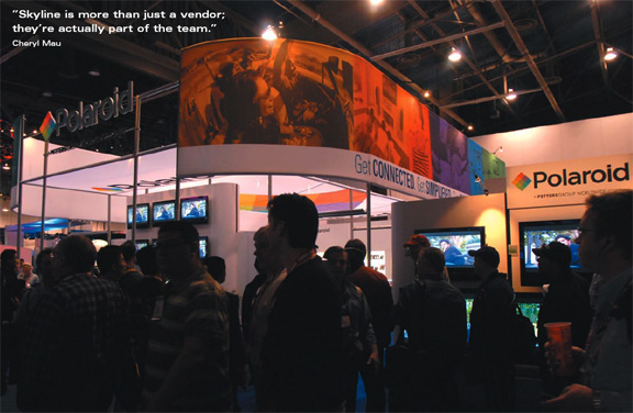 At CES, the Consumer Electronics Show, Polaroid Corporation squashed perceptions that narrowly define the company as instant cameras and film. A 7,000-square-foot exhibit reinforced reality by showcasing the brand's continued expansion into digital cameras and consumer electronics. Using a combination of owned and rental exhibit hardware, Skyline reconfigures and designs a fresh look for the exhibit each year. "Skyline is more than just a vendor; they're actually part of the team," says Cheryl Mau, Polaroid's Vice President of Marketing. "It truly is a partnership." Mau values Skyline's flexibility - working within a budget, responding to a change in direction, or coming up with options to solve a problem - and its commitment to quality. "Skyline has always been able to create an exceptional display that you'd think cost a lot more than we ended up paying," she says. "And I know they're just a phone call away with an answer to any question, with help on any problem we may encounter." Download printable version (.pdf) |