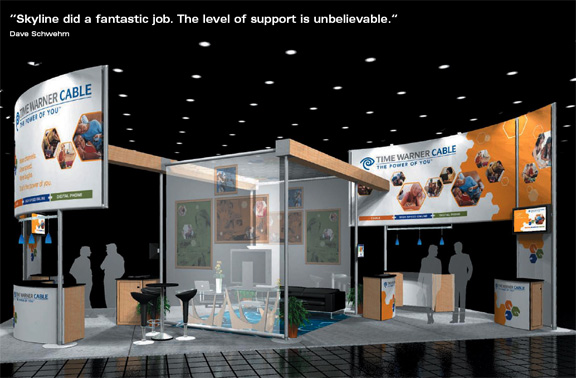 In planning an all-new exhibit, Time Warner Cable made a list of four wishes, and Skyline granted them all. "Skyline took all of our requirements into consideration and delivered a booth that actually exceeded our expectations. Everyone is excited about using it," says Dave Schwehm, Time Warner Cable's Senior Director of National Sales. What did the company desire and achieve? 1. Eye-popping impact. The graphics reflected the company's new logo, new graphics package and its tagline, The Power of You. For each show, Skyline manages a budget, handles shipping, sets up and dismantles the exhibit, and responds to spontaneous needs. Download printable version (.pdf) |