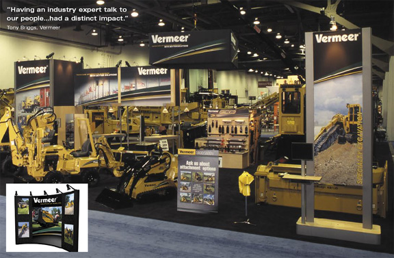 After updating the logos and decals on its industrial and agricultural equipment, Vermeer needed to update its trade show booth. Marketing Communications Manager Tony Briggs chose Skyline from among five exhibit companies, seeking to gain four improvements in a new 50'-by-50' exhibit: 1. Reduced shipping and drayage - weighs less and fewer crates 2. Modular design - can be reconfigured for various booth sizes 3. Eye-catching graphics - large photo collages on a 16-foot tower 4. Ease of assembly - lightweight components Skyline also provided training for 65 Vermeer staffers before the opening of the show. "Having an industry expert talk to our people on the do's and don'ts, how to qualify leads, and the importance of open-ended questions, had a distinct impact," Briggs says. National Account Program Download printable version (.pdf) |