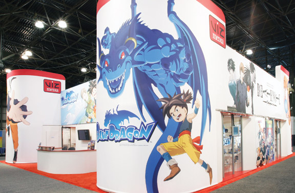 Knowing that one size cannot fit all exhibiting, VIZ Media craved different looks and layouts designed to fit different needs with different audiences for each of its three divisions. "That's what Skyline gave us. We're a cutting-edge company, and we should look like it," says Evelyn Dubocq, senior director, Public Relations for VIZ Media, a leader in graphic-novel publishing, animation and entertainment licensing of Japanese content. A trio of custom modular exhibits – from about 20'-by-50' to 50'-by-50' – super-sized impact with large-format graphics of VIZ Media characters and boosted effectiveness with more functional use of space. "My choice would be to deal with Skyline and nobody else," Dubocq says. "With Skyline, I would say, 'Here's what we're looking for, and here's what we have to spend.' Each time, they came up with options and made it work." She has been sold on Skyline service since first renting an exhibit in Las Vegas: "I expected to be there hours, waiting for it to be put up, but it was set up a day early. I said, 'This is what I want all the time.'" |