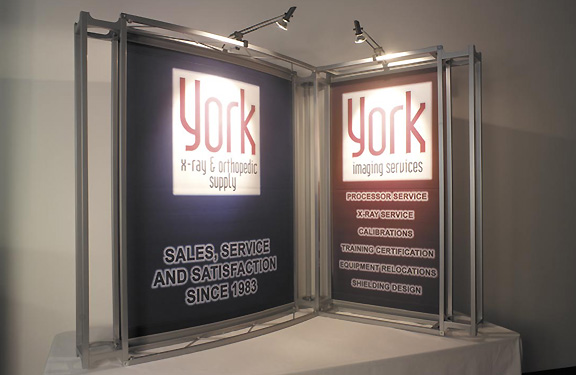 York X-ray instantly attracted attention and compliments with a tabletop display like no other. "It's unique, and that's good," says general manager Jerry Judd. "We didn't want to look like everyone else." The new Inliten® tabletop from Skyline features a sleek and sturdy structure that frames York's graphics for added impact. York annually exhibits at a half-dozen shows for chiropractors, orthopedists and other physicians in the Southeast. After nearly 15 years with a tabletop display that had all the flair of a science-fair project, York upgraded to elevate its corporate image. "Our new display looks modern and professional," Judd says. "It attracts people to our area." He also likes that setting up and changing graphics is easy. With Inliten, the company also can add shelves, suspend multiple layers of opaque or translucent graphics, or add components to expand the tabletop into a full-size exhibit. Download printable version (.pdf) |